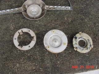 I am wondering if anyone has a reasonable understanding of how the 1955 ford horn operates.  I have the original horn ring that has been previously disassembled.  It consists of the chrome semi circular horn ring with plastic center cap. Under the cap is the horn operating mechanism. This consists of an upper ring with three arms that secures the plastic cap.  The second ring is domed and makes contact with the wire coming up the center of the steering shaft.  On top of the dome on this second ring is a piece of foam rubber that seems to press up against the plastic center cap.  This ring floats on three nylon shoulder bushings.  The final ring has the three tabs that engage and secure the horn ring to the steering wheel and also contains the large spring that keeps pressure between the horn ring and the steering wheel.  Three screws secure the three rings to the horn ring.  My questions are:  Is the piece of foam rubber simply a spacer between the plastic center cap and the upper contact ring or is it an integral part of the horn operation?  The three shoulder bushings appear to have been installed with the larger diameter shoulder facing down, however I am not totally sure if this correct as they can either be installed up or down.  Finally, where is the electrical contact made? Obviously the second of the three rings must contact something when the chrome ring is depressed but I can't I can't see what it is.  Any help would be appreciated.