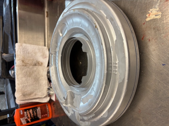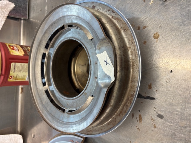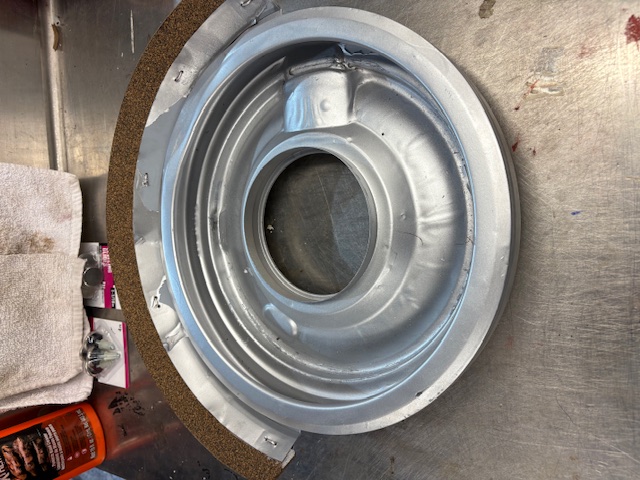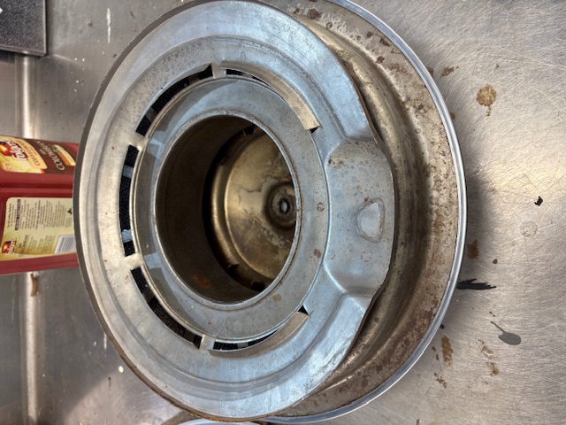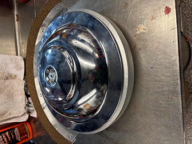 It’s an orig. ‘55 or ‘56 T-Bird oil bath AC. The raised bubble in the base faces up (accommodates teapot carb mechanism). Top is chromed. BTW: I currently have the ‘55/‘56 stainless top repro unit that is designed for a paper filter (modified though for increased airflow, with a larger K&N oiled filter), but when I finally install a modern/larger Holley carb, I may try to modify my original ‘55 oil bath chromed top to mate with a ‘57 repro base (?). If anyone has tried that but found not enough hood clearance, please advise.