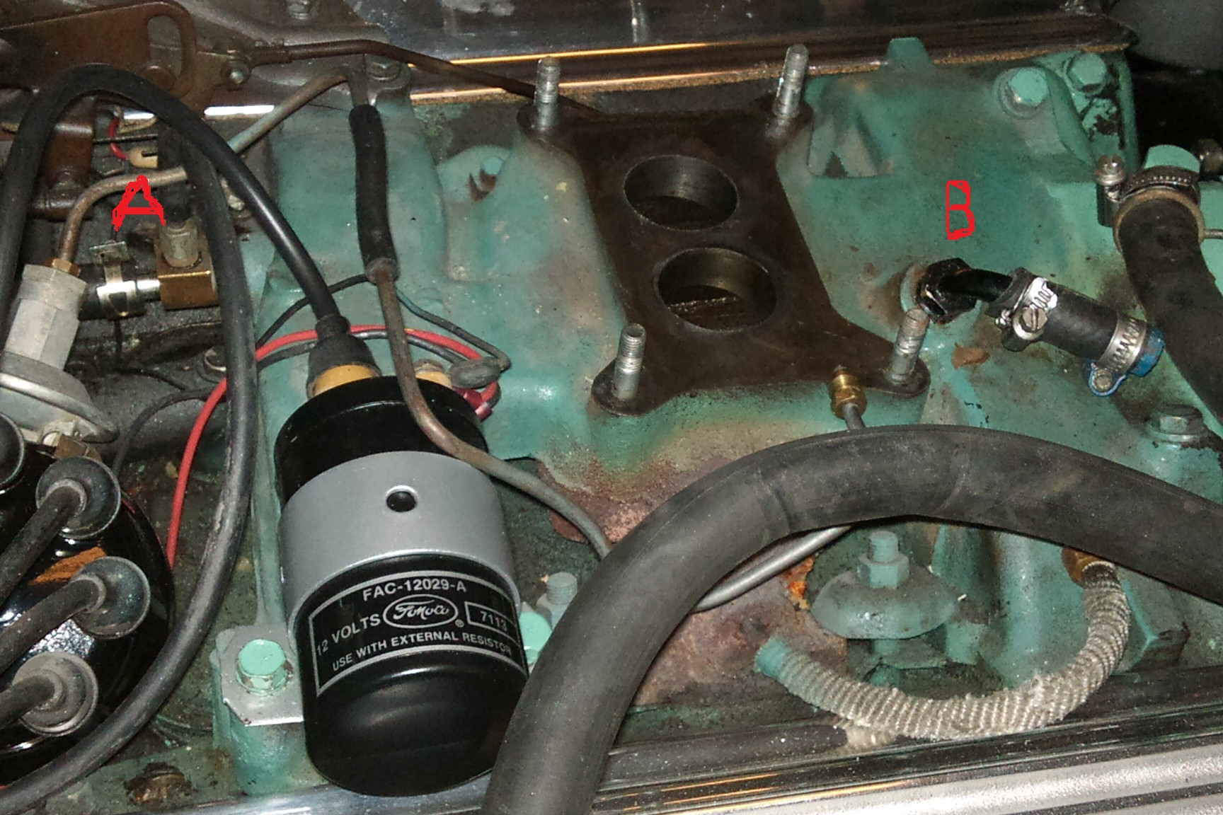 Hi! New to this forum,wish I´d found it earlier. I´m installing aftermarket power brakes in my 1959 Monterey. It has a 312 engine with 2-barrel Ford carbureter. When it comes to connecting the vaccuum hose for the power booster I have two options: Using the same port in the back of the manifold as used for heater vaccuum valve, that is "A" in the photo, or a vaccuum port on the manifold in front of the carb, that is "B" in the photo. Which one is used on cars with factory power brakes?