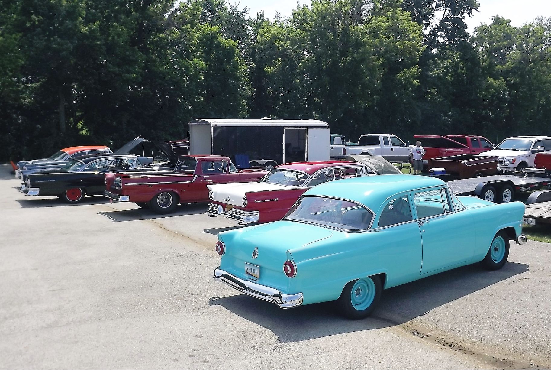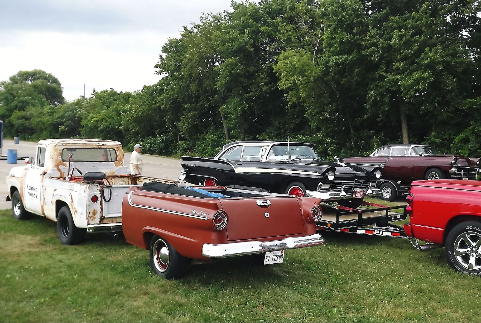 That's a pretty interesting shop truck pulling the Ranchero trailer. Judging by the amount of rubber on the rear tires and "Holman Moody" on the door, that truck also has a story to tell.